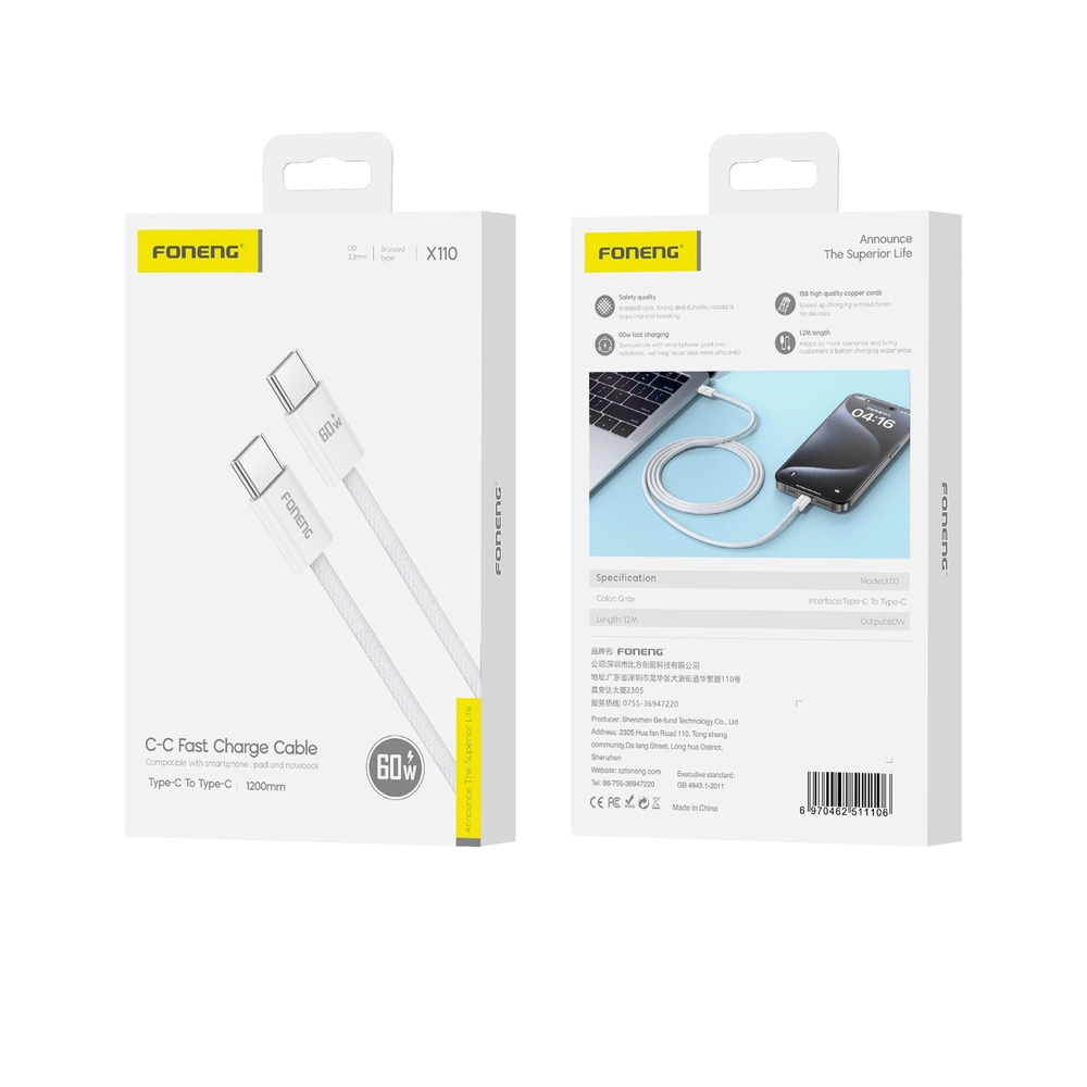 Foneng X110 60W Type-C to Type-C Örgü 1.2m Data ve Şarj Kablosu X110-60W