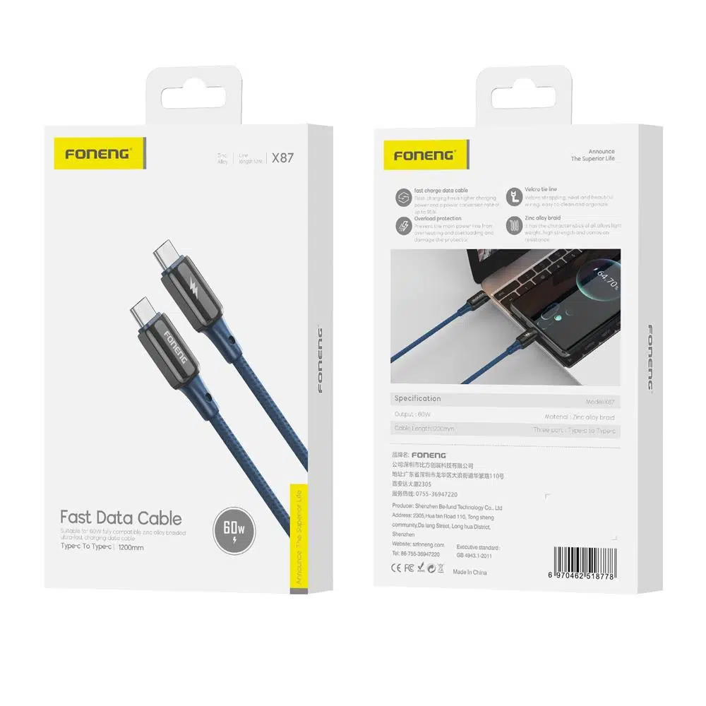 Foneng X87 60W Type-C to Type-C Örgü 1.2m Data ve Şarj Kablosu X87-60W