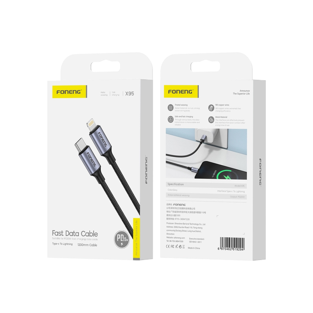Foneng X95 PD20W Type-C to Lightning Örgü 1.2m Hızlı Data ve Şarj Kablosu X95-PD20W