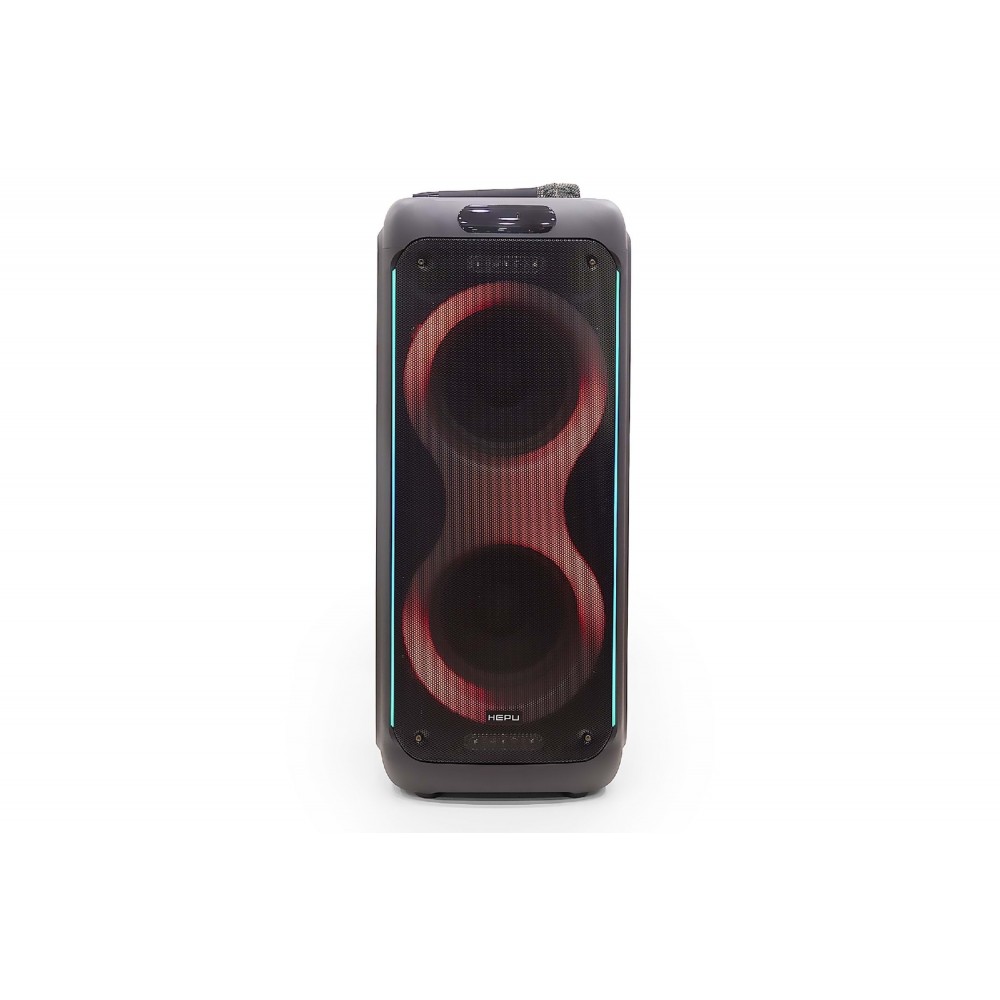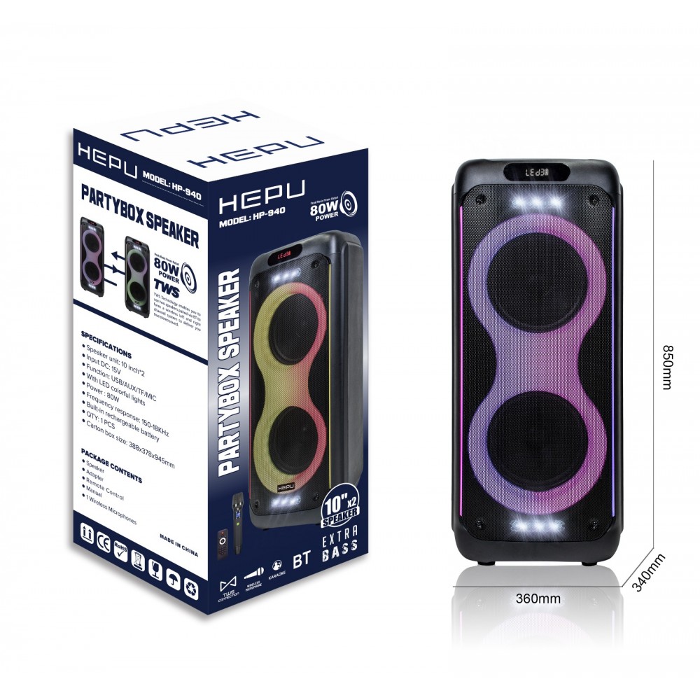 HEPU HP-940 80W 2*10" Extra Bass Kablosuz Mikrofonlu Bluetooth Hoparlör HEPU HP-940, 2 adet 10 inç hoparlörü ve 80W güçlü ses çıkışıyla hem iç hem de dış mekanlarda etkileyici bir müzik deneyimi sunan taşınabilir bir partybox hoparlördür. RGB LED aydınlatmalı ön paneli ile ortama dinamik bir ambiyans katar. Bluetooth, USB, AUX ve TF kart desteği sayesinde çok yönlü kullanım sağlar. TWS özelliği ile aynı modelden ikinci bir hoparlörle kablosuz stereo eşleştirme yapılabilir. Kutu içeriğinde bulunan 1 adet kablosuz mikrofon ve uzaktan kumanda ile karaoke, anons ve organizasyonlar için ideal bir çözümdür. Öne Çıkan Özellikler Teknik Bilgiler Kullanım Alanları Kutu İçeriği