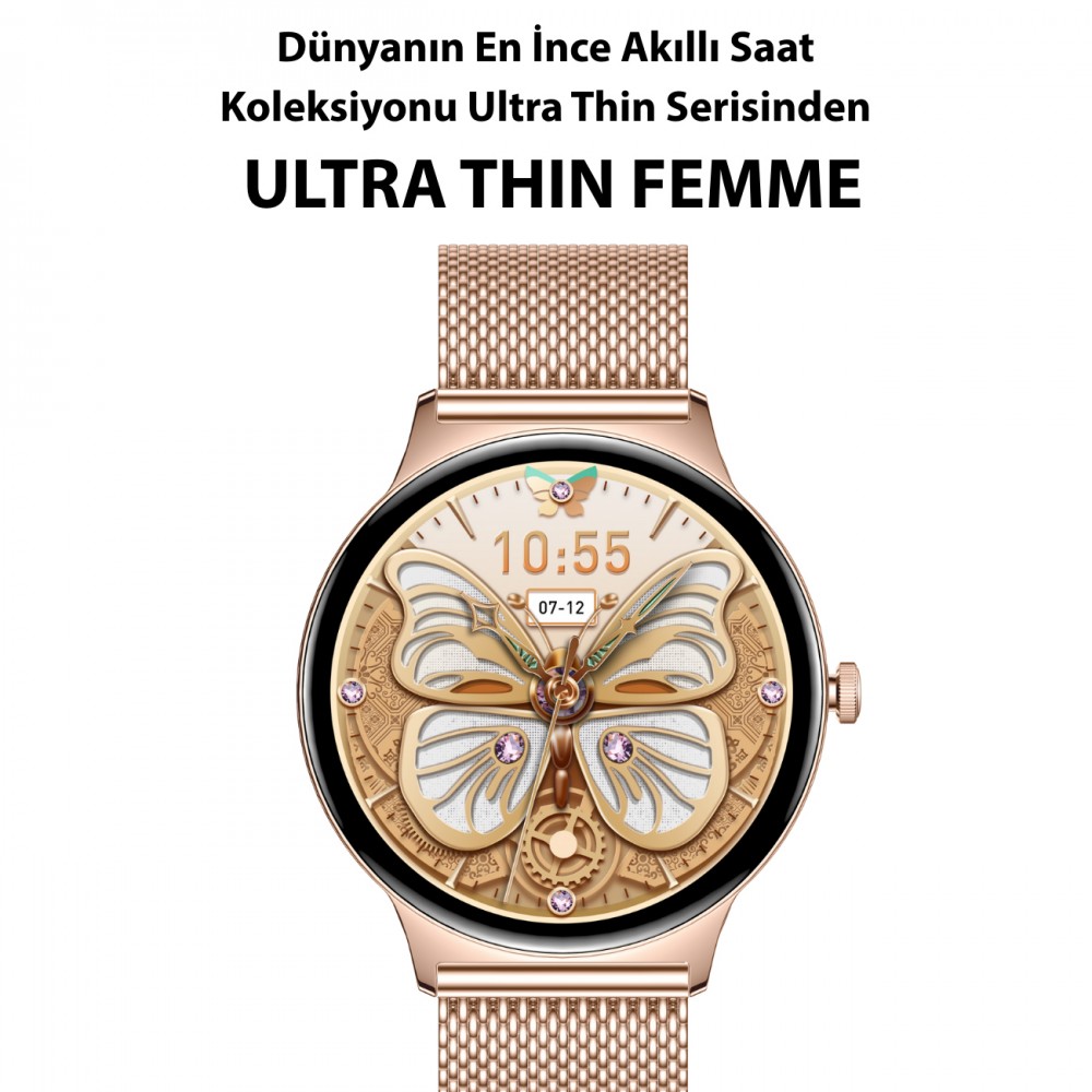 Logia Ultra Thin Femme, zarif ve ince tasarımıyla öne çıkan, şıklığı ve fonksiyonelliği bir arada sunan bir akıllı saattir. Sadece 6.5 mm kasa kalınlığı ile ultra ince bir yapıya sahiptir. 1.43 inç HD AMOLED ekranı, canlı ve net görüntüler sağlarken, Bluetooth arama özelliği sayesinde telefonunuza dokunmadan görüşmelerinizi yönetmenize olanak tanır. Hem iOS hem de Android cihazlarla uyumlu olan bu saat, günlük yaşamınızda size eşlik edecek ideal bir aksesuardır.Logia Ultra Thin Femme Akıllı Saat - Metal Kordon - iOS ve Android Uyumlu