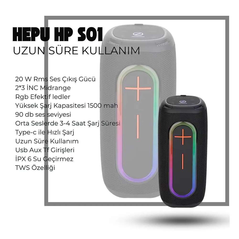 HEPU HP-S01 20W Taşınabilir Kablosuz Bluetooth Hoparlör Özellikler Bluetooth Versiyon: V5.3 Kutu İçeriği · HP-S01 Bluetooth Hoparlör